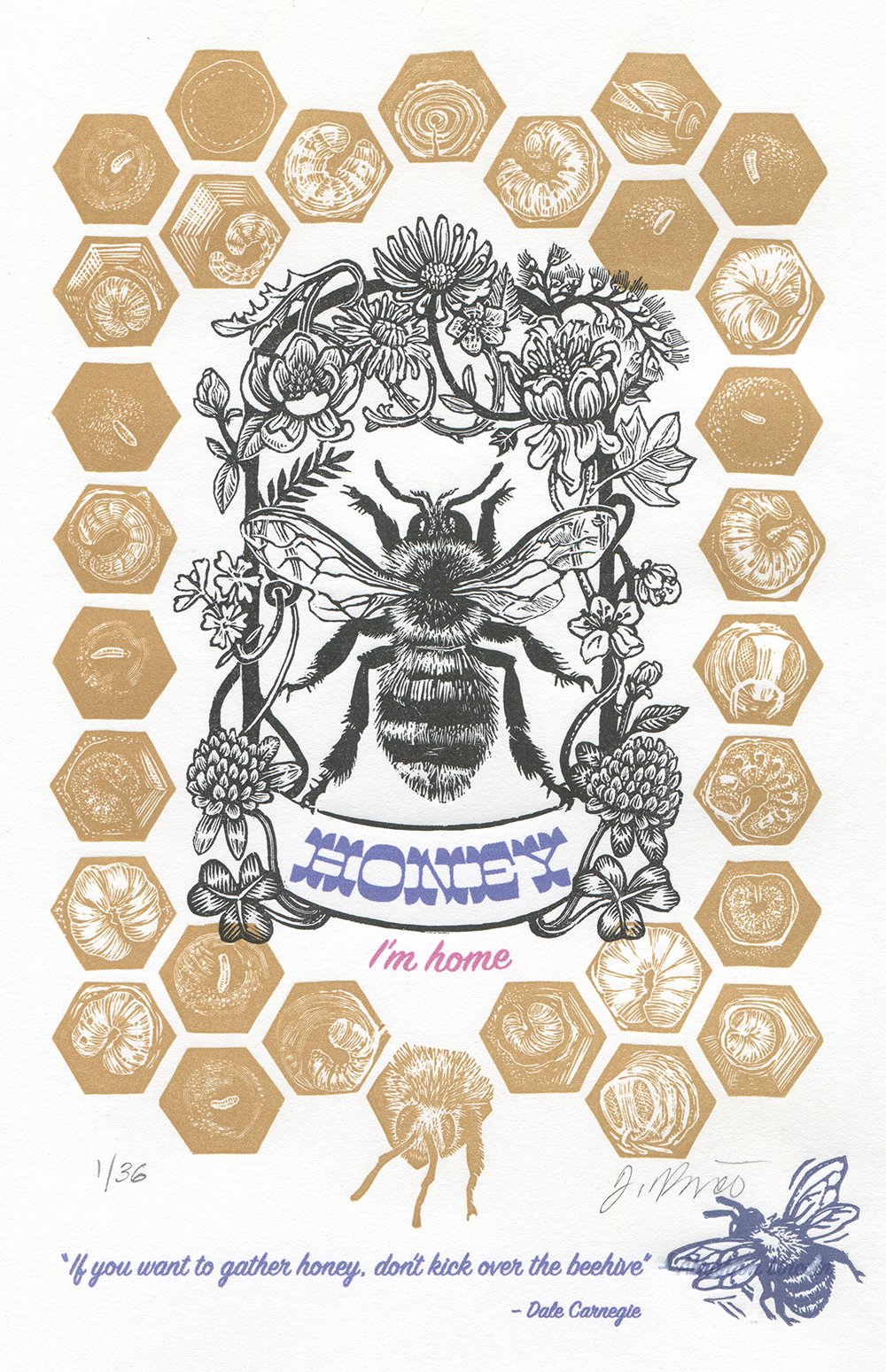 A honey label begging for more. It’s a bit kitschy and a bit silly with a dash of seriousness. The quote: “If you want to gather honey, don’t kick over the beehive” is from Dale Carnegie’s How to Win Friends and Influence People. The original bee image was originally made for Karine Maynard of Maynard Studios‘ honey label. Immediately surrounding the bee are floral sources of food. The hexagonal larvae cells were added to celebrate the Wood Engravers’ Network‘s 30th anniversary – find the burin, the sand bag and the end grain block in the cells to see wood engraving’s influence. The rest of the cells show multiple developmental stages of the honey bee.